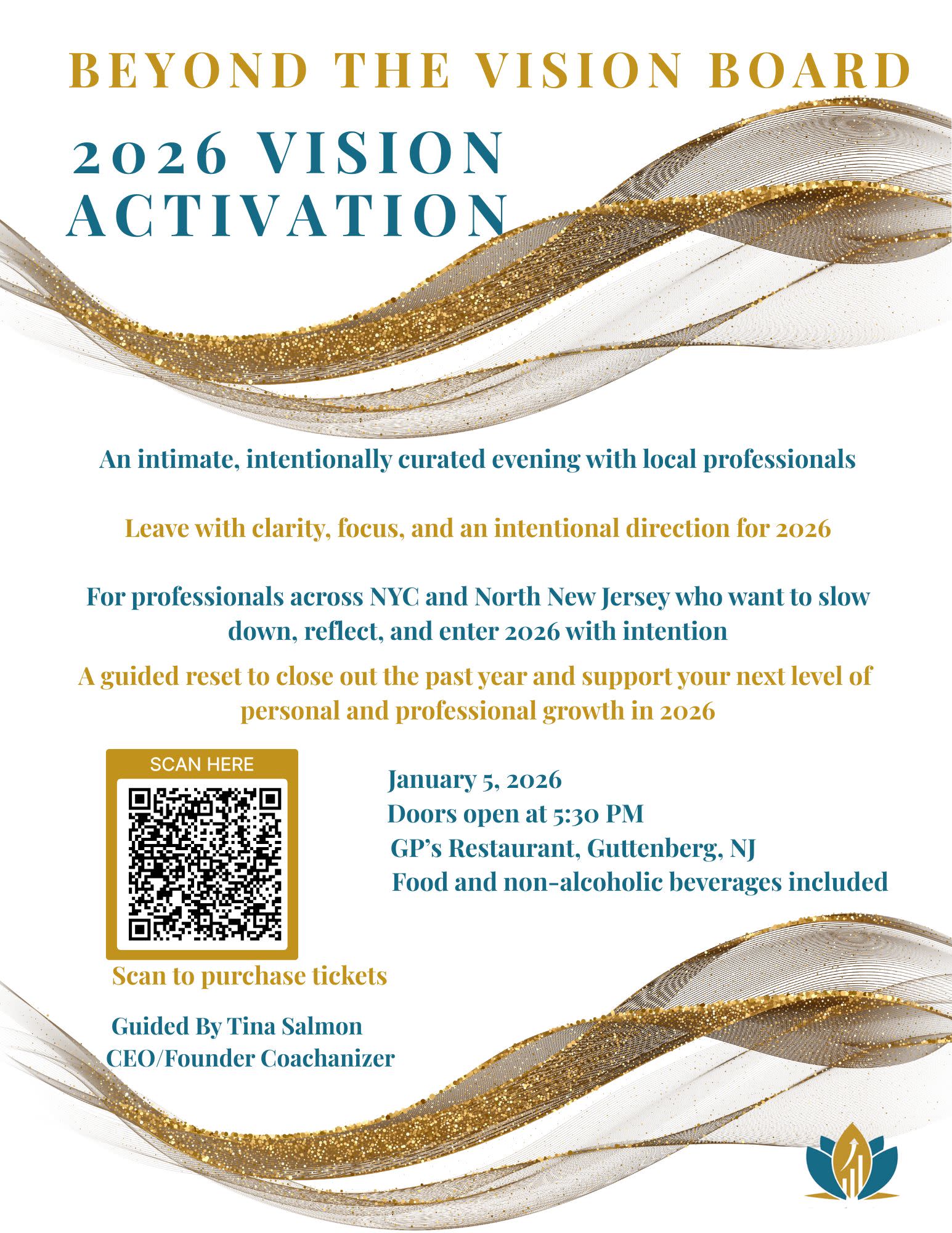 A curated experience for local professionals seeking clarity and intentional connection. Vision Activation 2026 is not a traditional vision board party. It is a curated, neuroscience-informed reset for professionals who want to enter 2026 with clarity, alignment, and intention. You will be guided through a structured activation process to close out the past year, release what no longer fits, and set clear direction for the year ahead. The experience brings together guided reflection and facilitated conversation in a calm, intentional environment with local professionals. The focus is clarity, self-trust, and sound decision-making. Light food and non-alcoholic beverages are included. Space is intentionally limited to preserve the quality of the experience. You will leave with a clear sense of direction for how you want to move forward in 2026. About the Facilitator This experience is guided by Tina Salmon of Coachanizer Consulting, a licensed psychotherapist and leadership coach with over 20 years of experience partnering with professionals and organizations to drive sustainable personal and professional growth. Venue This experience is hosted at GP’s Restaurant, a family-owned Hudson County restaurant serving as a gathering place for local families for over 40 years.